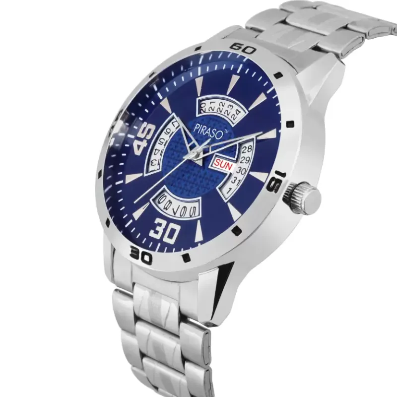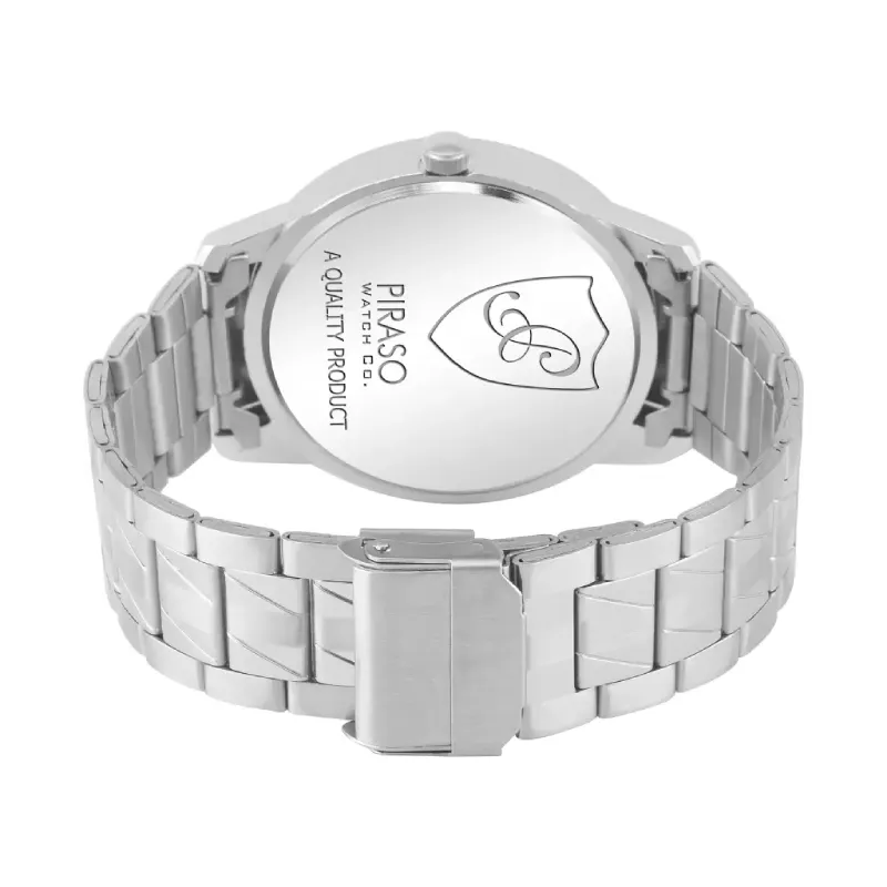 Begin your journey with the watch’s striking aesthetic, featuring a lustrous blue dial that commands attention while maintaining an air of sophistication. The round dial, adorned with the Piraso brand logo, is encased in robust stainless steel, reflecting both durability and elegance. The silver stainless steel chain strap complements the blue dial, offering a sleek look that is both comfortable and stylish. The clasp type buckle ensures the watch remains securely on your wrist throughout your daily activities.