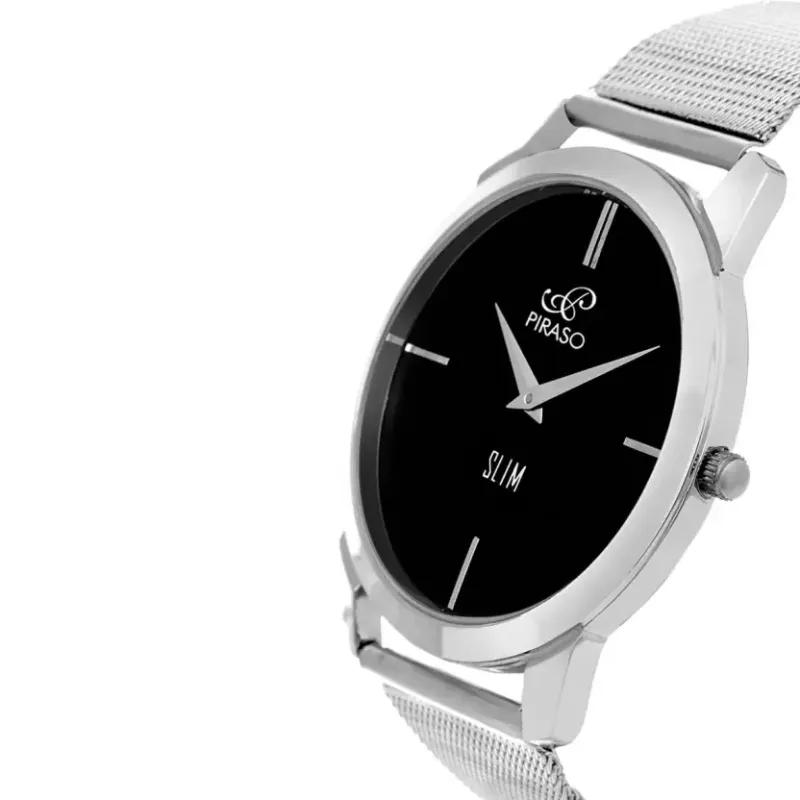 Immerse yourself in the elegance and precision of the Piraso 1584 SL04 Black Dial Silver Mesh Strap Analog Watch, crafted for the discerning man who appreciates both style and functionality in every facet of his life. From the boardroom to a celebratory evening out, this watch seamlessly adapts to both casual and formal settings, making it a versatile companion for all your memorable moments.