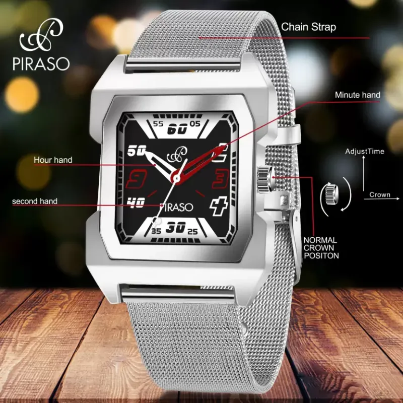• Dial: The eye-catching rectangle tonneau-shaped dial, adorned with the Piraso brand logo, serves as the centerpiece. Its multicolor palette ensures it stands out, enhancing any outfit with a splash of vibrancy.
