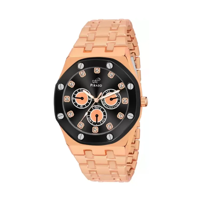 - Design: The watch boasts an elegant black dial adorned with the iconic Piraso logo, exuding an aura of timeless charm and sophistication. The round dial is housed in a durable stainless steel case, offering both style and durability.